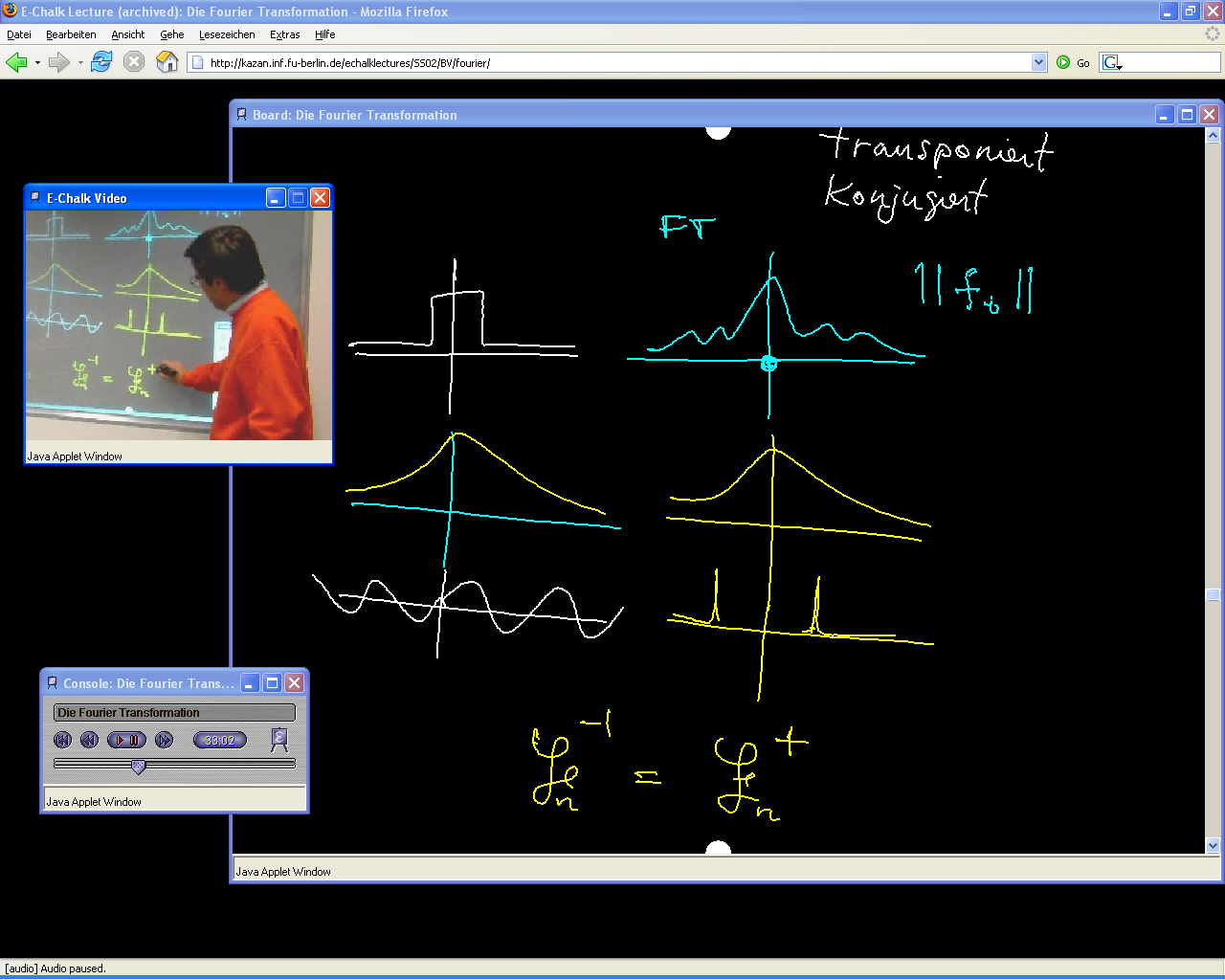 To view the demo (2.7MB) click the image above. a low-bandwidth version is available here (348 kb) This chalklet is for recognizing hand-drawn mathematics. It handles standard algebraic notation--addition, multiplication, division, subtraction and exponentiation--and matrix operations--addition, multiplication, subtraction. The matrix elements are allowed to contain arbitrary algebraic expressions. This Chalklet transcribes mathematical formulas into LaTeX and can be used to evaluate them. The demo shows how a matrix addition is written down and automatically transcribed into LaTeX. The "pretty print" output in the popup window is the typeset LaTeX result.