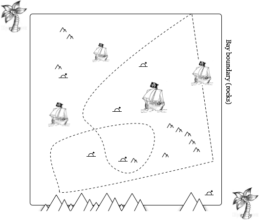 Rectangular Bay is, as its name suggests, a rectangular bay (doh — well, actually it is square!). It is surrounded on all sides and littered within by dangerous ship-smashing rocks. Word is out that Polygon Pete, the richest, meanest pirate that ever sailed the seas, has deposited marker-buoys around the bay and on its rocky islands. Beneath each of these is suspended a rope attached to a small chest of gold.
